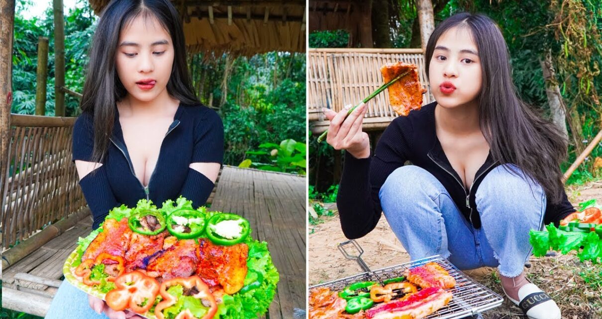 Beautiful Girl Cooking // BBQ & Grilled Beef Recipes // Primitive Food HB